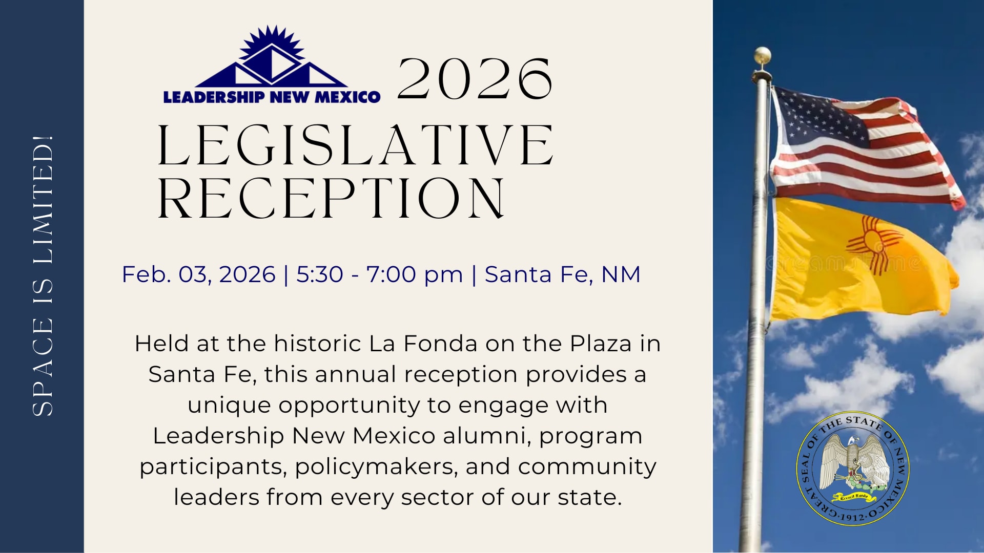 Leadership New Mexico invites you to our 2026 Annual Legislative Reception, an evening designed to bring together leaders from across New Mexico during the legislative session for meaningful connection, conversation, and collaboration.